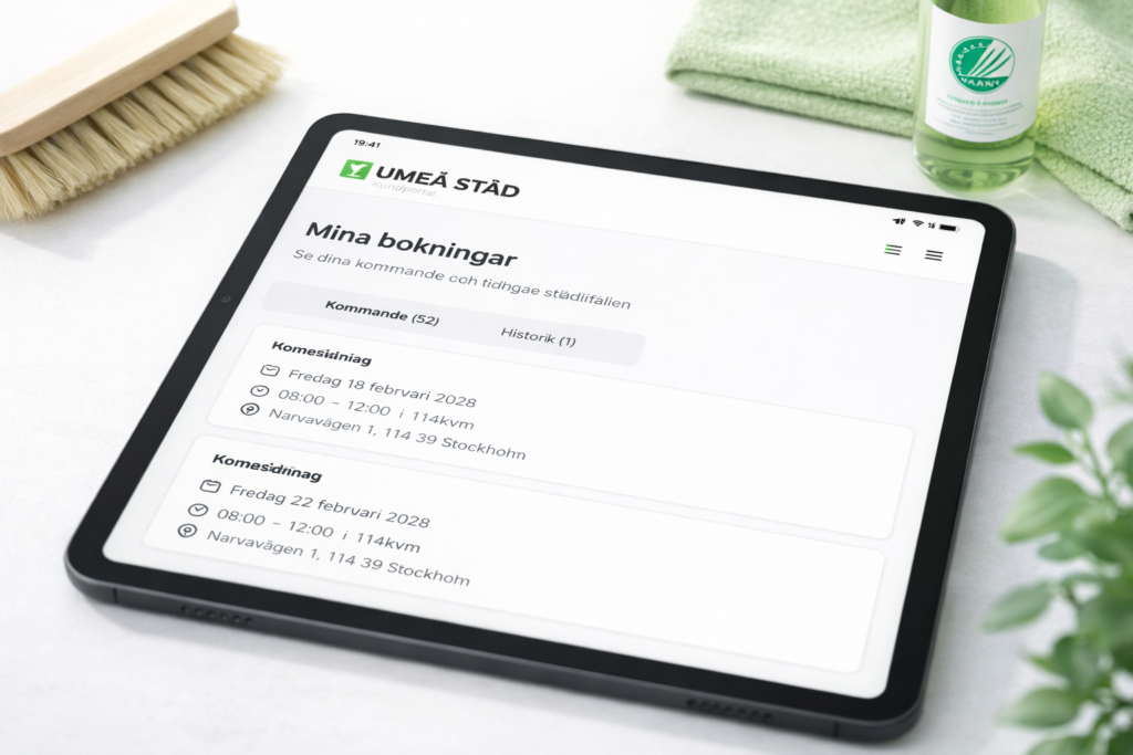 Logga in på din personliga kundportal för att se dina bokningar, ändra datum, lägga till tjänster och kommunicera direkt med din dedikerade kontaktperson. Vi har investerat i ett modernt och enkelt bokningssystem – du ska aldrig behöva ringa för att ändra ett städtillfälle. 💚
